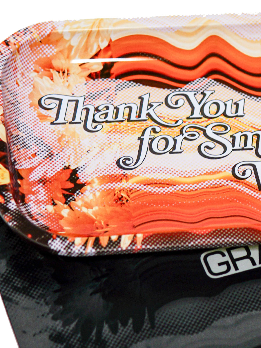 The newest addition features the GRAV logo on top of warped flowers in the background. The interior reveals the phrase, "Thank You for Smoking With Us!" on a vivid-colored warped flower background.