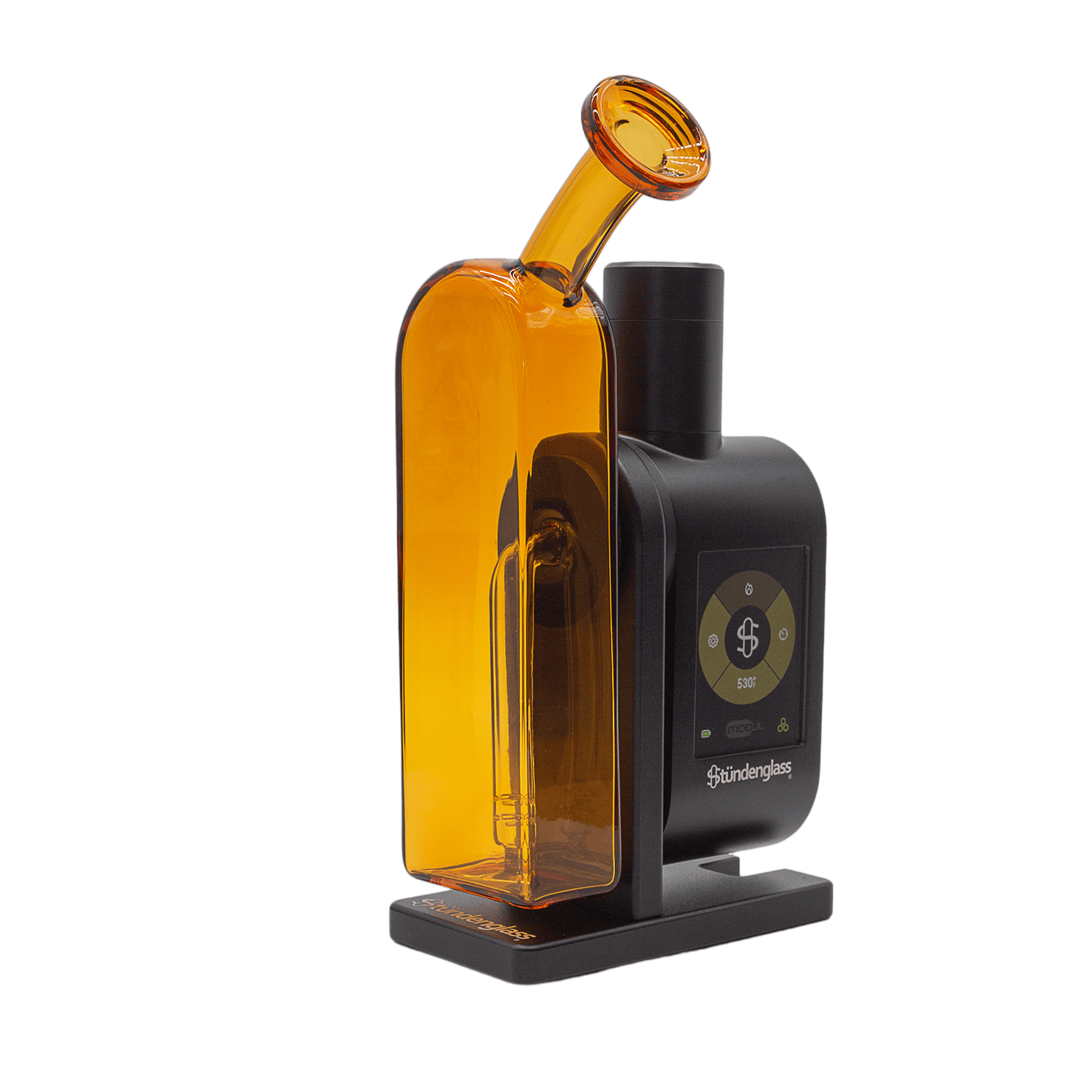 The Deluxe Travel set comes complete with a Modül, a Dok with amber glass, along with Modül Tanks for both dry materials and concentrates, all enclosed in a premium fabric, drop-resistant travel case.