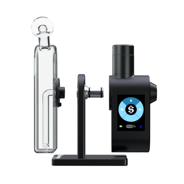 Introducing the Stündenglass Modül Dok Bundle for Dry Material. Coupling a Modül for Dry Material with the Dok allows the user to experience all of the Modül features without the need for a gravity infuser. The Dok features 3mm borosilicate glass, a 4 hole welded stem percolator, and an anodized aluminum stand, and attaches seamlessly to the Modül via a standard Stündenglass magnetic adapter to create a powerful all in one device that can heat dry material to temperature in as little as 15 seconds. A 90° USB-C charging cable allows for simultaneous charging and use thanks to easy access to the Modül charging port.
